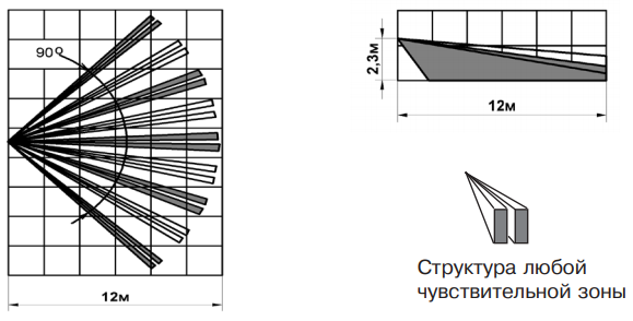 | Угол зоны (Охранные датчики) | 90° объемная |